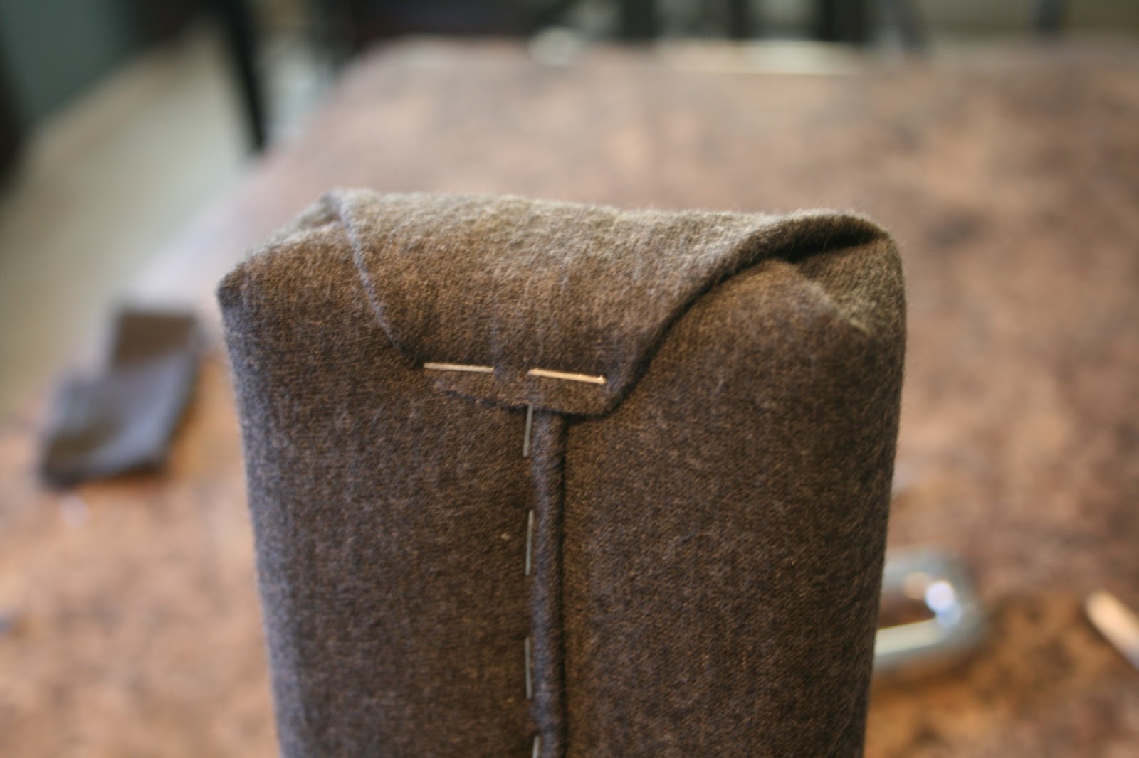 The cheapest and easiest way is to use 2 x 4’s. I always upholster the legs before attaching them, so I can move and adjust them if needed. Upholstering them is easy. Simply cut some extra batting the length of your legs. Wrap it around and attach with staples. No need to go crazy with staples, just a few to hold it in place. The edges of the batting should meet in the middle, but I cut my piece a little narrow. If that happens to you, no worries, it will be covered with your seam.